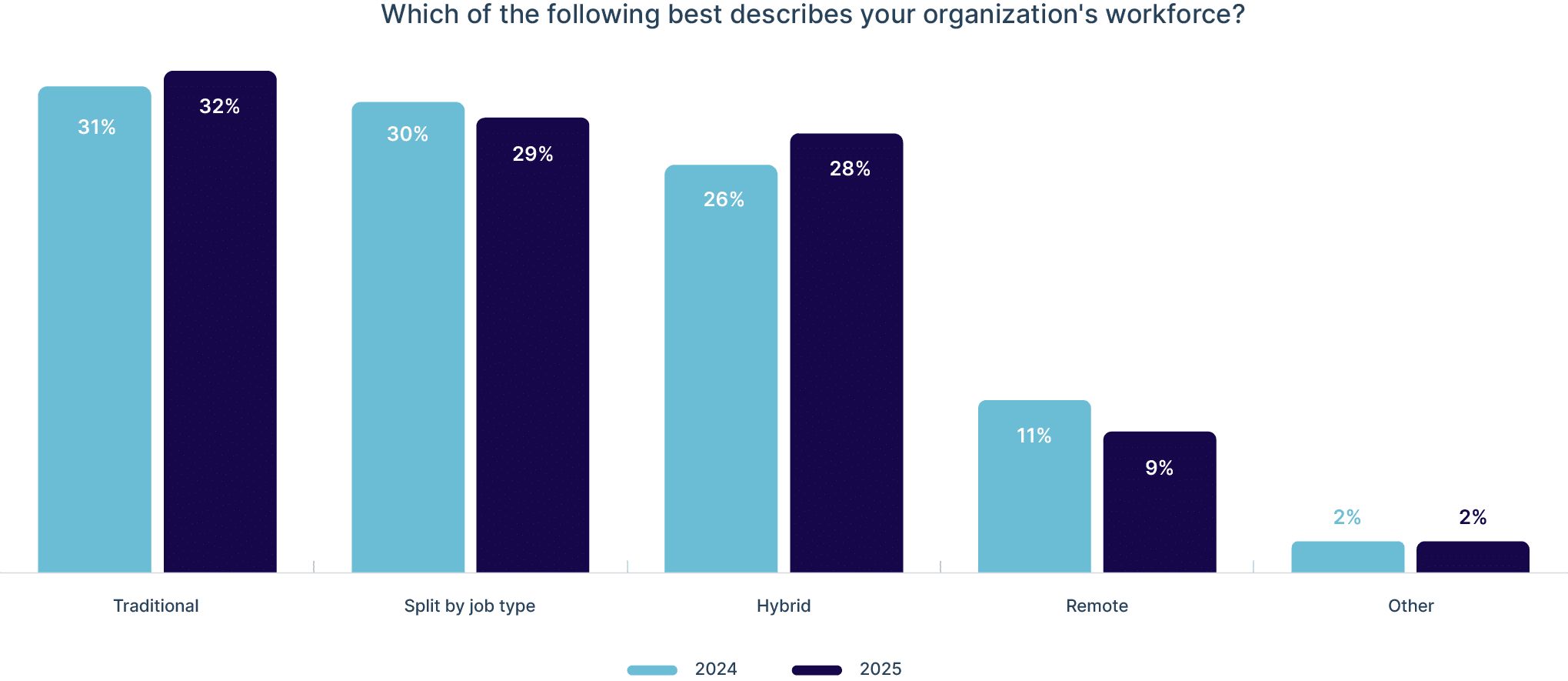 As remote work shrinks, hybrid and traditional workplace environments haven’t expanded. Instead, most orgs are splitting up workplace environments based on the type of job employees perform.