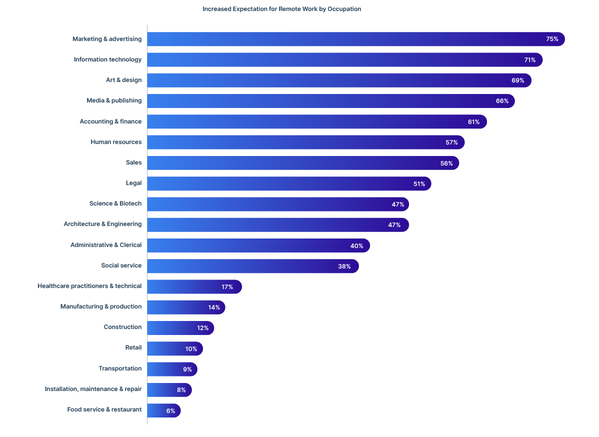 Of course, employees don’t necessarily want to be fully and permanently remote. Although job seeking behavior is highest for employees who can’t telecommute at all (55 percent), it is lowest for employees who say they telecommute most of the time (5 percent). It is actually a bit higher for employees who say they telecommute 100 percent of the time.