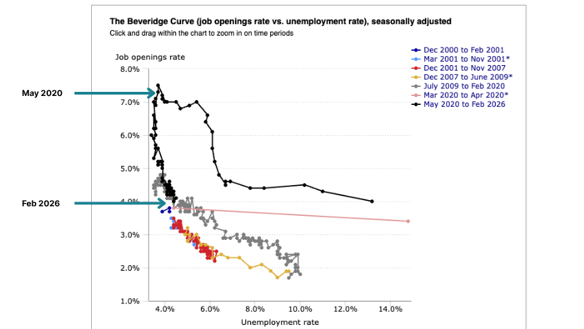 Economists are squinting at it for a signal. For the last two years, the curve hasn’t looked like a curve. It’s a vertical line with far fewer job openings, but without the expected shift in unemployment.