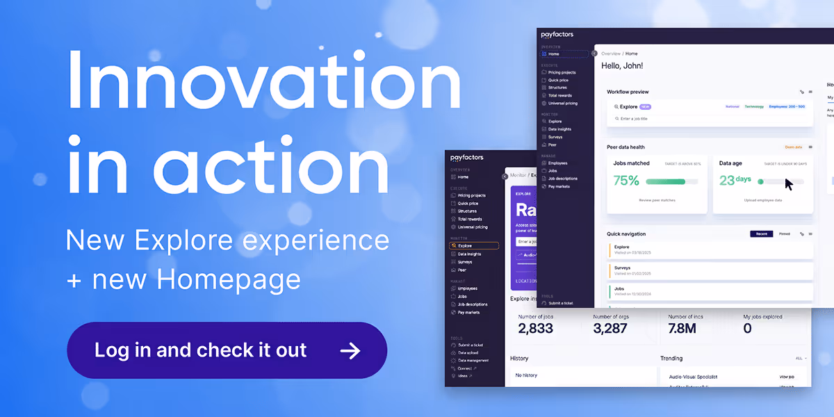 Meet Payfactors Explore — a new way to interact with the market that surfaces dynamic, AI-powered insights to help you work more strategically. Whether you’re pricing a job, identifying pay trends, or advising HR and leadership, Explore gives you a real-time window into what’s happening now, so you can act with confidence, not guesswork.