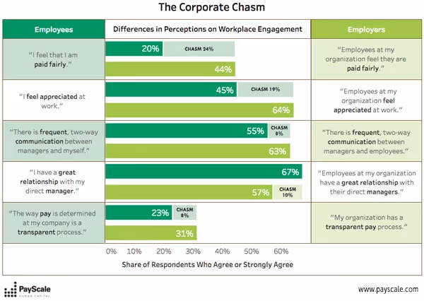 Today we release the eighth annual installment of PayScale’s Compensation Best Practices Report.A strong theme emerged this year showcasing the connection between compensation and organizational culture. There is evidence that some organizations have discovered this connection, linked compensation with culture and – as a result – are thriving. But, for most, there's pretty big disconnect between how employers think their employees feel about pay and how employees actually feel.We’ve called this disconnect “the Corporate Chasm.” Results from PayScale’s 2017 Compensation Best Practices Report support this disconnect: 44 percent of employers believe their employees are paid fairly, but only 20 percent of employees agree.