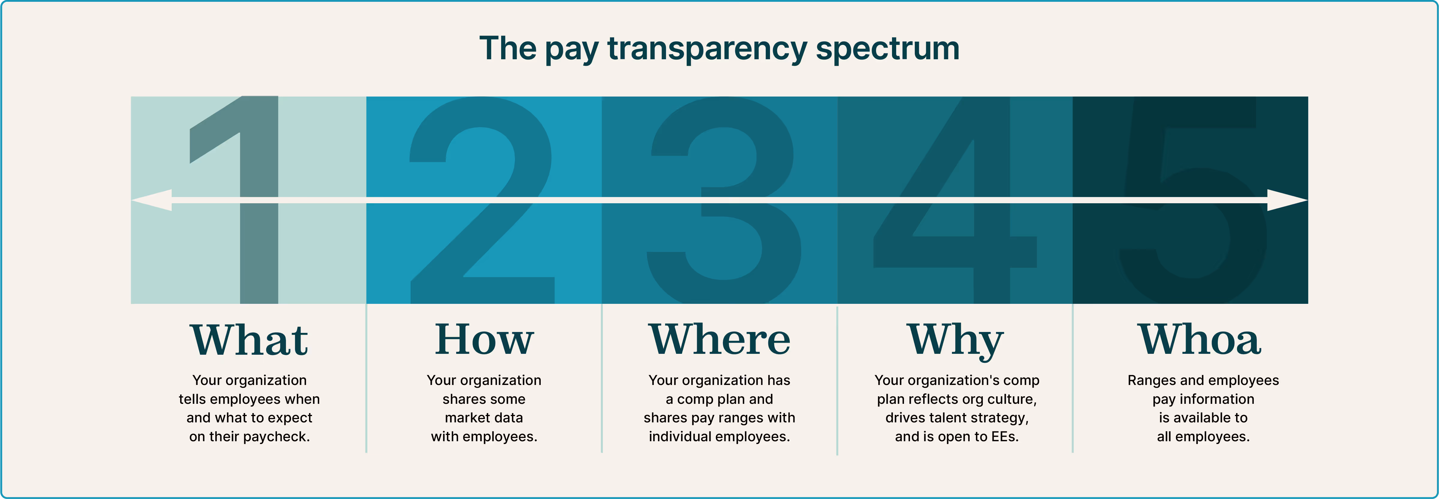 Finally, Level Five is total transparency: a fully open-book approach where ALL salaries and pay ranges are visible. Most organizations aren't ready to publish the pay of their CEO. And that's okay. Radical transparency is far from the norm.