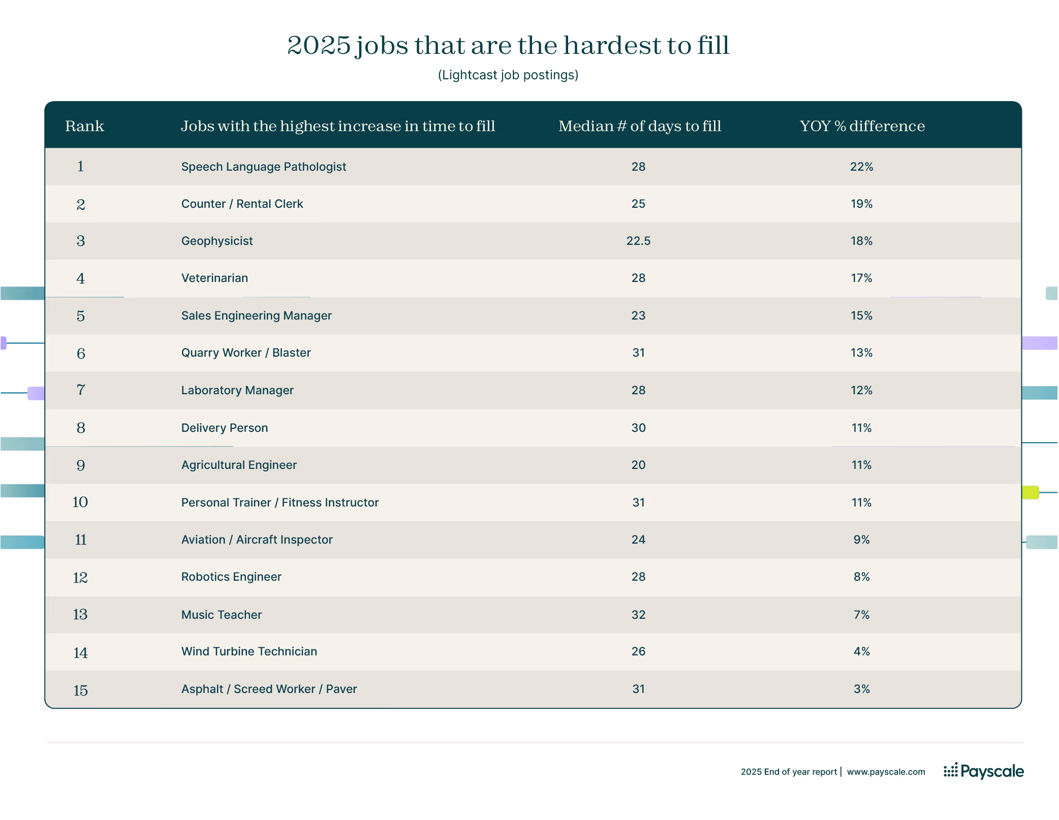 Payscale analyzed 618,271 respondents that completed a salary profile between 11/1/2024 and 10/31/2025 by U.S. workers to rank the prevailing 2025 hot jobs list. The final list of rankings represents 4,416 respondents across 15 job titles. We also provide a top list of jobs with the highest quit rates, which leveraged respondents who answered the following research question: