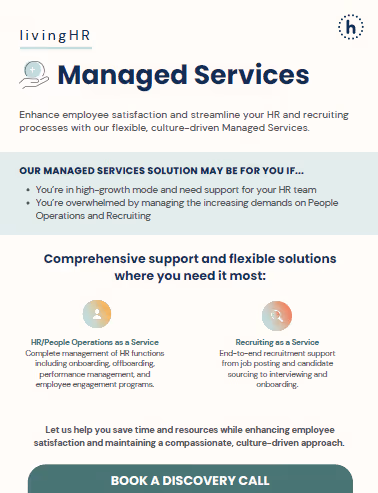 livingHR is a people-first consulting firm that offers customized solutions in culture, talent strategy, leadership development, and employee experience to help organizations create inclusive, human-centered workplaces. livingHR provides lift, scale, and support to the HR/People Functions globally through Managed Services, Projects & Retained, Interim or Fractional Support, and Recruiting & Search.